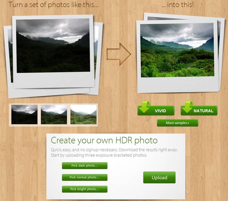 Nyissuk meg a www.yohdr.com oldalt. Töltsük fel a sötét képet a „Pick dark photo…” gomb megnyomásával, a normál képet a „Pick normal photo…” , és végül a világos képet a „Pick bright photo…” gombbal. Ezután nyomjuk meg az upload gombot.