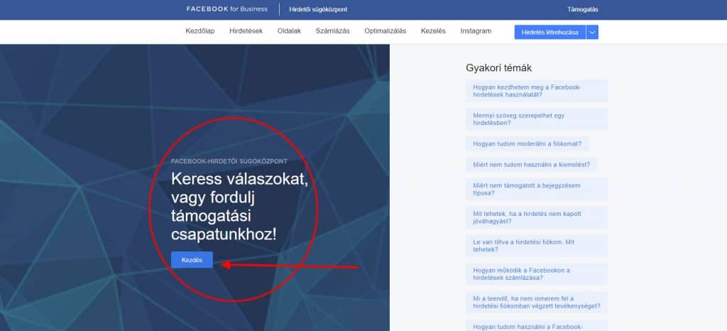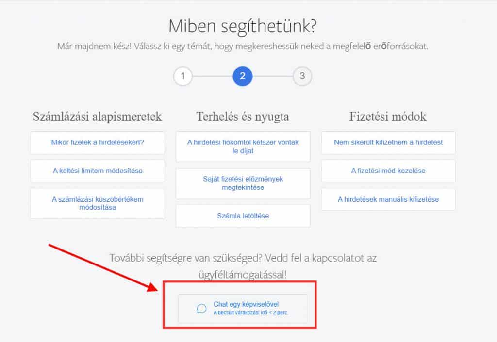 A leggyorsabb módja a kapcsolatfelvételnek a Facebook chat supportja. Ezt az alábbi linken érhetjük el: https://www.facebook.com/business/help/support