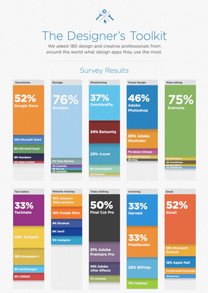 A fastcodesign.com oldalán jelent meg egy infógrafika arról, hogy 10 népszerű témában milyen szoftvereket használnak leginkább a designerek.