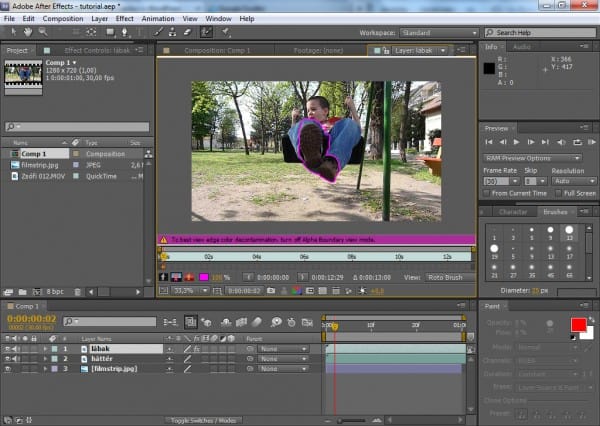 Ekkor vissza kell váltanunk a Roto Brush-ra és képkockánként manuálisan kell igazítani a kijelölést. Képkocka mozgást a Page Up-Page Down gombokkal válhatunk.