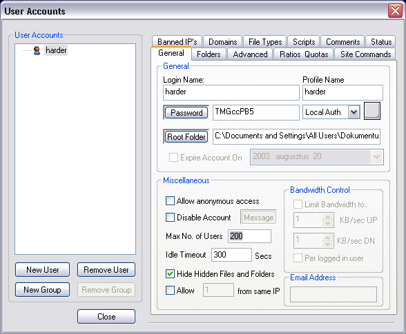 A „listen on..” opciónál állíthatjuk be, hogy a user kapcsolódását mely IP-n és mely porton fogadja a szerver. Pl. ha most beállítanám, hogy a „harder” acc-val csak a 127.0.0.1-es IP-n és a 6875-es porton lehessen bejönni, akkor biztos hogy nem tudom használni más gépről ezt a hozzáférést, és csak ezen a porton fog menni a dolog.