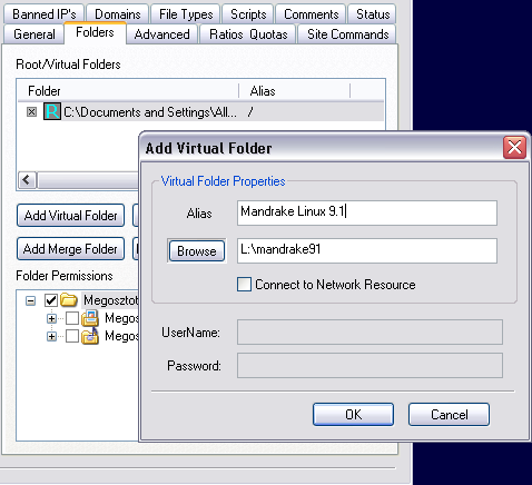 A képen látható, hogy a virtuális könyvtárak kiválasztása felettébb egyszerű dolog. A „browse” gombbal lehet kiválasztani a belinkelni kívánt könyvtárat gépünkről, és az „Alias” mezőben adhatjuk meg, hogy a userek milyen néven láthassák mikor belépnek.