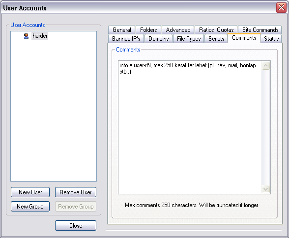 Az „allow user to idle„-vel lehet engedélyezni (kép10), hogy a user akkor is belépve maradhasson, ha nem csinál semmit. Ezt tiltva lehetőség van a NOOP parancs tiltásásak, illetve beállíthatjuk, hogy a user csak adatforgalom esetén maradhat belépve, különben a szerver kidobja.