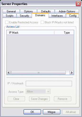 Itt szintén azokat a IP(tartományokat) határozhatod meg, melyekről beléphetnek (vagy épp fordítva, nem) a szerverre. Pl. megadhatsz egy listát, melyekről be lehet lépni a szerverre, minden egyéb helyről letiltja a bejövő kéréseket. A freeware verzióban ez is inaktív opció.