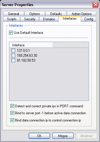 Módosítható, mely kapcsolaton figyelje a szerver a bejövő kéréseket. A 127.0.0.1 mindig a saját géped, a 169.254.x.x a hálózatos IP-d lesz, míg a 81.182.x.x (nekem most ez az IP-m, Axelero-s tartomány) esetemben a „netes” IP-m.