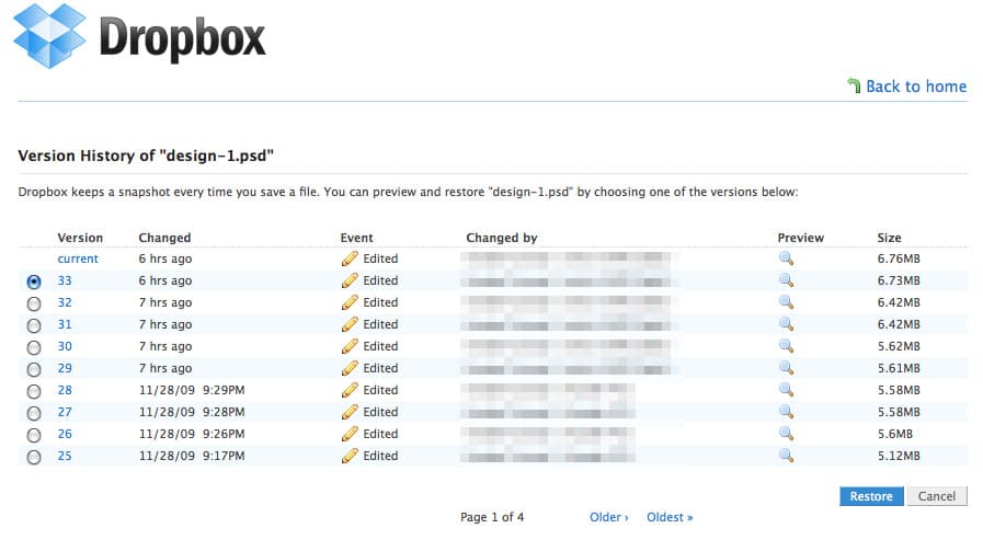 No ez is egy iszonyatosan hasznos funkció benne, hogy lehet a fájlok változásait követni és visszamenőleg is elérhetőek a korábbi verziók. Pl. ha az ügyfél meggondolja magát és úgy dönt, hogy neki mégis a 4 nappal ezelőtti állapotban tetszene a honlap (te meg persze rámentettél azóta már párszor a psd-re), akkor sincs gond, mert a webes felületen visszamenőleg le tudod tölteni az előző verziókat. Ugyanez igaz persze a HTML, CSS és egyéb állományokra is, gondolom nem kell különösebben ecsetelnem, hogy mennyire jó tud lenni még egy ilyen fapados „SVN potló” megoldás is.