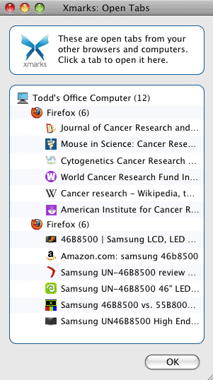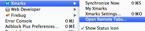 Az „Xmarks / Open remote tabs …” -ra kattintva kapok egy kis ablakot, ahol a gépeim neve, a rajta lévő böngésző és a böngészőben megnyitott (és szinkronizált) honlapok láthatóak. Bármelyikre kattintok, a lapokat betölti azonnal és a munkát ott folytathatom, ahol azt a másik gépen és másik böngészőben abbahagytam.