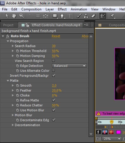 Aktiváljuk a Roto Brush – t, ember+ecset az ikonja. Ezt a Puppet Pin és az Eraser tool között találjuk a felső szerkesztőlécen.