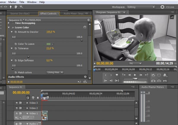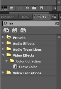 Beimportáljuk a filmet, majd az Effects panel Leave color szűrőt a videóra húzzuk.