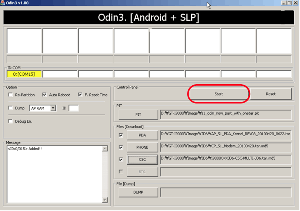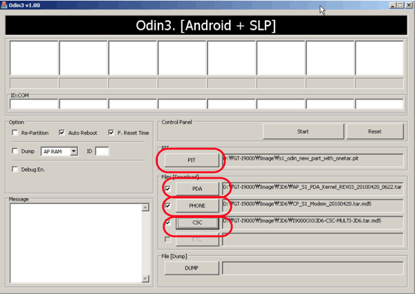 A legfrissebb Odin-ban van egy „Bootloader” gomb ahova szintén be lehetne állítani egy fájl elérési útvonalát. Erre nem volt szükség Samsung Galaxy S esetében, üresen hagytam.