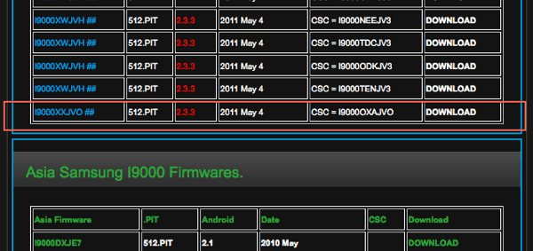 A képen is látható meg persze a lapon is, de figyelj rá: a „Europe Samsung I9000 Firmwares.” táblából szedd le az anyagot.