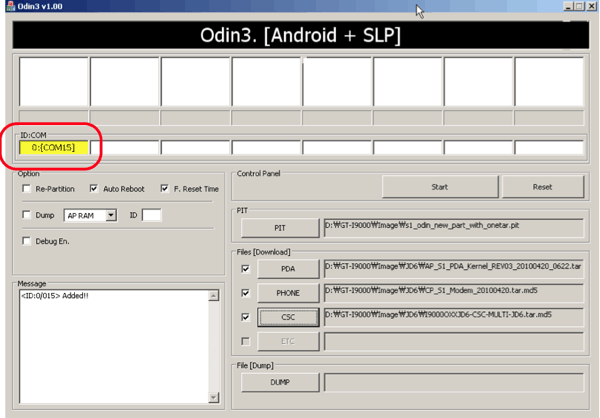 A következő lépés, hogy a telefont csatlakoztatnod kell a számítógéphez. Akkor van rendben minden, ha az Odin-ban megjelenik egy sárga blokk amiben kiiírja, hogy milyen COM porton jött létre a kapcsolat.