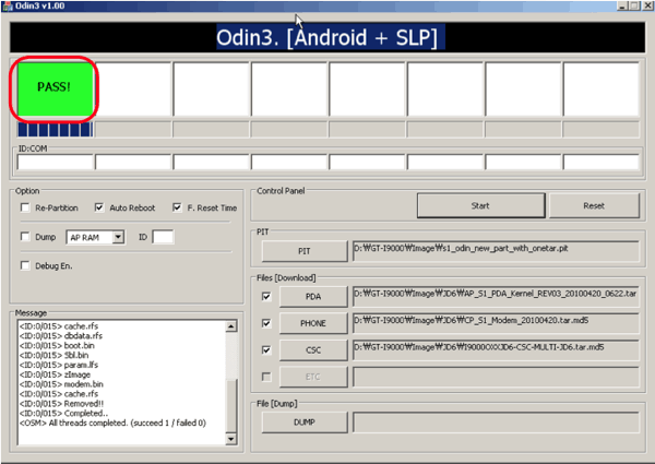 Amint a frissítés lefutott és rendben is volt, az Odin-ban a korábbi sárga mező feletti rész kizöldül, benne egy PASS! felirat látható.