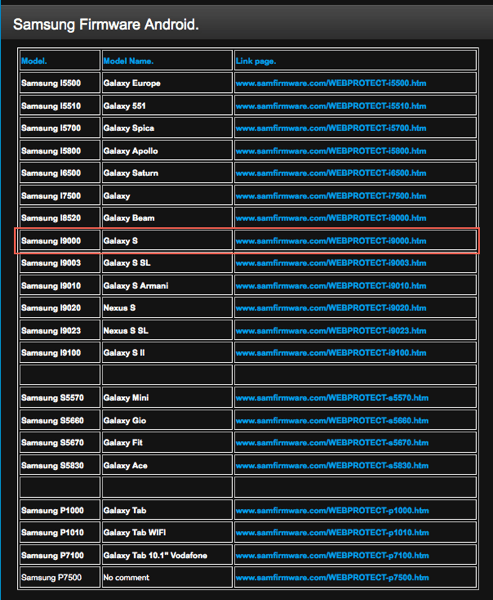 2.) válaszd ki a „Samsung I9000 | Galaxy S” sort és kattints a www.samfirmware.com/WEBPROTECT-i9000.htm linkre.