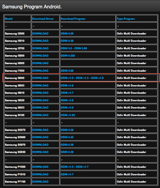Itt megint meg kell keresni a Samsung I9000-s sort és onnan letölteni a legfrissebb Odin v1.8-as kliensprogramot.
