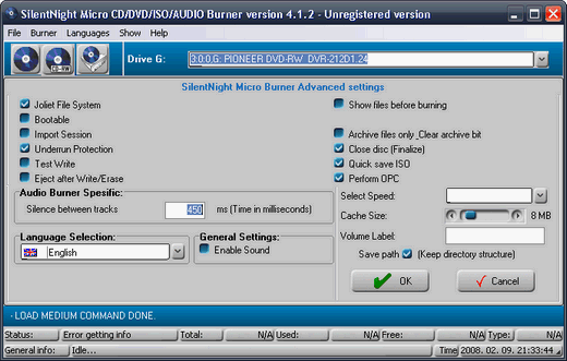 SilentNight Micro CD/DVD/ISO/Audio Burner advanced setting ablaka