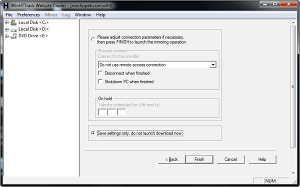Állítsd be, hogy mit szeretnél csinálni a projekt során. Pl. komplett honlap letöltését szeretnéd, vagy már meglévő mentést szeretnél frissíteni? Arra is van lehetőség hogy különálló fájlokat tölts le kötegelt módon, tehát beadod a fájlistát és a program mindet lementi a gépedre. Lehet korábban leállított, de most folytatni kívánt letöltést is választani illetve a program képes HTML linkeket is ellenőrizni (pl. egy kedvencek listát végignéz, hogy minden link valid-e).