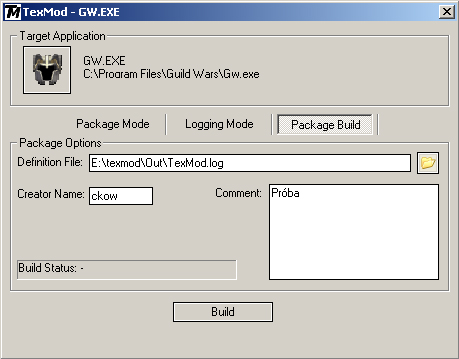 Ha ezzel megvagyunk, írjuk felül a kép(ek)et az Out mappában, majd válasszuk a Package Build-et és tallózzuk a .log-ot az Outban, végül kattintsunk a Build-re és adjunk nevet a modunknak.