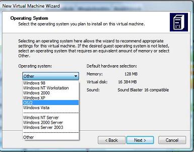 Ezután ki kell jelölni, hogy milyen oprendszer lesz a gépen. Mi most egy XP-t fogunk használni, kiválaszthatjuk a listából. Ezután kiírja, hogy ő milyen virtuális hardvert javasol, de ehhez nem muszáj ragaszkodni. Ne ijedjünk meg, a virtuális lemez mérete nem fog egyből 65 Gb-ot elfoglalni a merevlemezünkön, csak mindig annyit, amennyire szüksége van. Klikkeljünk a Next-re.