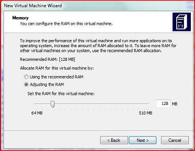 Ezután beállíthatjuk, hogy a virtuális gépnek mennyi memóriája legyen (Adjusting the RAM) vagy elfogadhatjuk amennyit a program ajánlott (using the recommended RAM) Ha több mint 512 MB memória van a gépünkben, akkor érdemes legalább 256 MB-ot adni a most készülő virtuális gépünknek, egyébként maradjuk a defaultnál. Next.