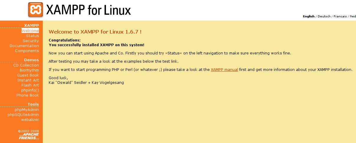1 2 3 4 5 | Starting XAMPP for Linux 1.6.7... XAMPP: Starting Apache with SSL (and PHP5)... XAMPP: Starting MySQL... XAMPP: Starting ProFTPD... XAMPP for Linux started. |