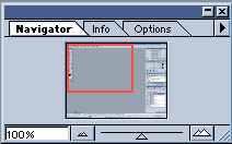 15.jpg (13889 bytes) A Navigator nagyon fontos, itt állítható be könnyedén hogy hány százalékos nézetben nézzük a képet, illetve hogy meilyik részét nézzük. a kis csúszka a zoom opció, kézzel is húzigálhatjuk, illetve a két végén a kis ikonokkal léptékesen nagyíthatunk és kicsinyíthetünk.