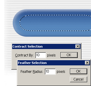 Töltsd be újra a kiválasztást a pirula channel-ről (ha nem lenne kiválasztva). Csökkentsd a kiválasztott területet méretét (Select > Modify > Contract)  10 pixel mellett kétszer. Majd lágyítsd a kiválasztott terület széleit 10 pixellel: selection (Select > Feather).