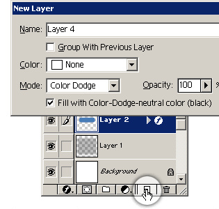 Alt-click a New Layer gombon a Layer paletta alján. Hozz létre egy új Color Dodge layer-t color-dodge-neutral black color-ral. Töltsd ki a kiválasztást fehérrel; a Paint Bucket tool segítségével.