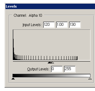 Válaszd a Image > Adjust > Levels-t. Állítsd az  Input levels-t 120, 1, 130-re és nyomj OK-t. Töltsd be a kiválasztást (Select > Load Selection) az erről a channel-ről.