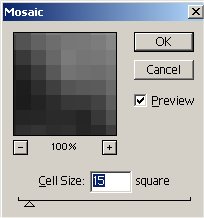3.) Filter > Pixelate > Mosaic menüpontot keresd ki, és ott a pixelek értékét válaszd 12-és 15 közé, attől függően, hogy mekkorára akarod majd az „áramköröket”.