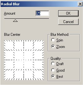4.) Ismét a filter menüben dolgozunk, Filter > Blur Radial Blur. Ott használd a következő képen látható beállításokat. Majd térj vissza a filter menübe: Filter > Stylize > Emboss itt 135 fokkal 2 szélességgel és 200%-os erősséggel dolgozz
