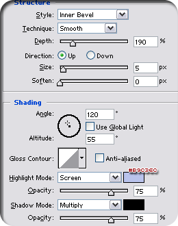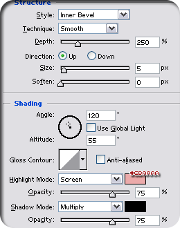 és itt válasszuk a Bevel and Emboss… menüt, majd állítsuk be a bal oldalon látható kép szerint.