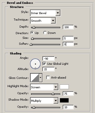 8.) Bevel and Emboss beállítás értékei: