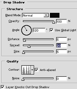 A menüben válaszd a LAYER/LAYER STYLE/DROP SHADOW-t (vagy akár a layerre is rákattinthatsz duplán, a felugró ablakban szintén megtalálod). A képen látható módon állítsd be te is a vetett árnyék tulajdonságait.