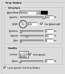Először a DROP SHADOW-ban módosítsd a beállításokat a következőkre: DISTANCE: 3 / SPREAD: 28 / SIZE: 5 (lásd 2.kép)