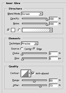 Következő terület az INNER GLOW. Itt módosítsd a BLEND MODE-t SCREEN-re, az OPACITY-t 100%-ra, a NOISE-t szintén 100%-ra, a CHOKE-t 0-ra, a SIZE-t 5-re, a RANGE-t 50-re és végül a JITTER-t 73-ra.