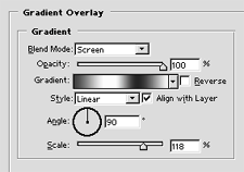 Most keresd meg a GRADIENT OVERLAY-t és módosítsd a STYLE-t linear-ra, az ANGLE-t 90-re, a SCALE-t 118-ra.