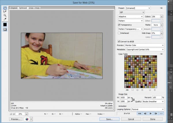 A beállításoknál (jobb felső sarok) a formátum legyen GIF, a színek száma 256.