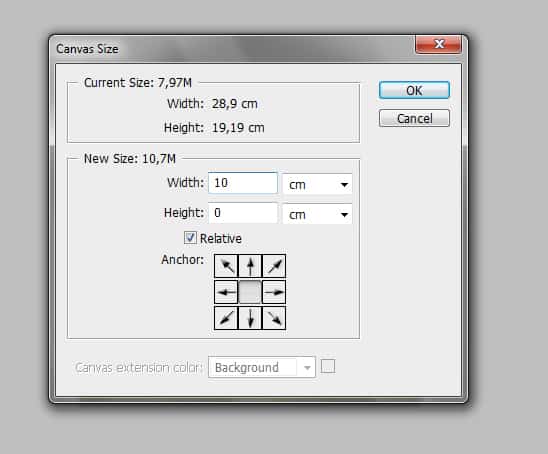 Következő lépésben : Image / Canvas size, itt bepipáljuk a Relative jelölőnégyzetet és megnöveljük 10 cm – rel a Width értéket.