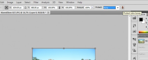 Most már nem lesz inaktív a funkció, ha kiválasztjuk, és a felső szerkesztőlécen megjelenik egy Protect opció is. A legördülő menüben csak a None elérhető jelenleg. Mellette van egy embert ábrázoló ikon ez a Protect skin tones amit kattintással be lehet kapcsolni.