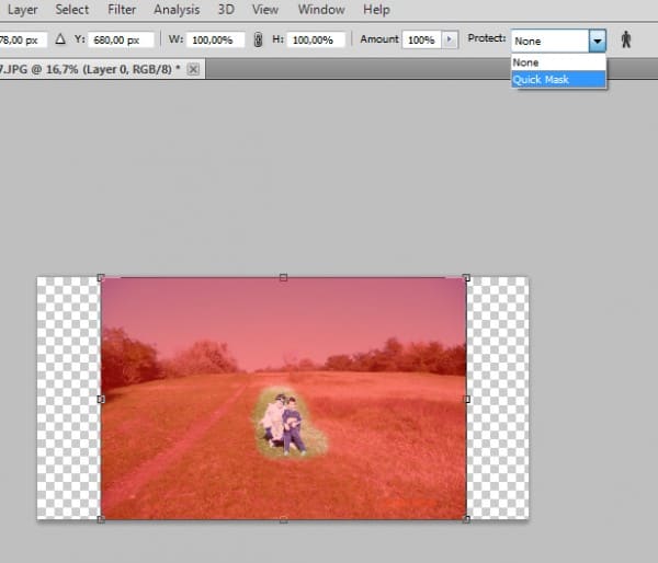 Ha most kiválasztjuk az Edit / Content-Aware Scale funkciót akkor már megjelenik a Protect fülnél a Quick Mask lehetőség is. Válasszuk ki ezt az opciót.