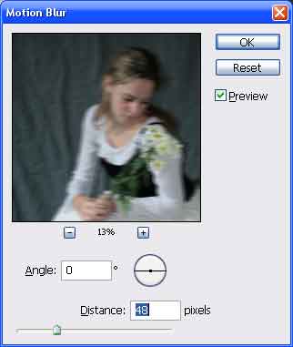 Ha ezzel megvagy olvaszd össze a layereket, a kékeset és az alatt lévő nem kékeset, a Ctrl+E-vel. Az így kapott réteget másold le, majd újabb Blur jön, de ezúttal Filter > Blur > Motion Blur. Ezt a beállításd alkalmazd:
