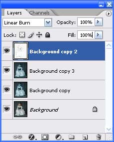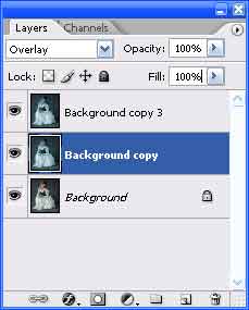 Most tedd láthatóvá az eredeti hátteret attal, hogy a mellette lévő szemre kattintasz. És a layerek Blending módját állítsd át az itt látható módon: