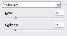 Szóval. Másold le újra az alapképedet és húzd a layers paletta legtetejére. Majd Filter > Filter Gallery és ott „Photocopy” ezekkel a beállításokkal:
