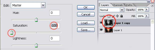 Nyissd meg a képet és duplikáld a réteget (Ctrl+J) -ezen a rétegen fogsz végig dolgozni- majd nyisd meg a Hue /Saturation ablakot. (Ctrl+U vagy Image>Adjusments>Hue/Saturation). Itt állítsd a Saturation-t a minimumra, ahogy a képen is látod.