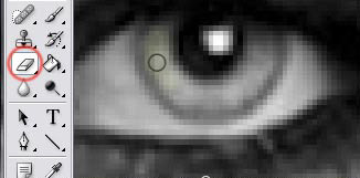 Válasz ki a radírt, Eraser Tool-t, és a vastagságát állítsd 5px-re, de kisebb mérettel is dolgozhatsz. Én puhaszélű ecsetet választottam, mert úgy nem lesz majd olyan nagy az kontraszt az arc és a szem között. Még mindig a fekete-fehér képen dolgozva törüld ki a szivárványhártyát és a szembogarat, hogy az alatta lévő réteg előtűnjön.. Mást nem kell.