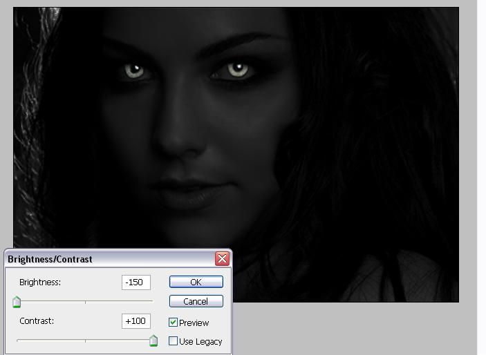 Válaszd még mindig a színtelen réteget és állítsd Brightness-t és a Contrast-ot is minimumra.