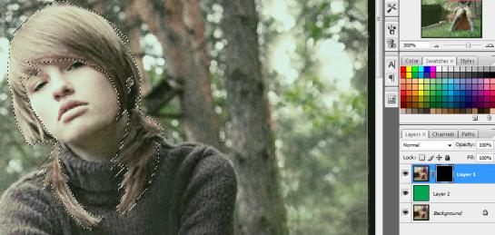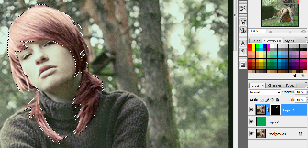 Most érdemes lesz nagyítani a képen, én 300%-osra tetem. A maszkolt réteg maszkján (:D) kezdjük el körbe jelölni a hajat. Nem muszáj az egészet egyszerre, részenként is lehet, de a kijelölt réteget mindig fessük be