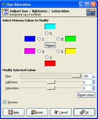 3.) Használjuk az Árnyalat-telítettség eszközt ( Réteg -> Színek -> Árnyalat-telítettség), és állítsuk be az árnyalatot 180-ra.