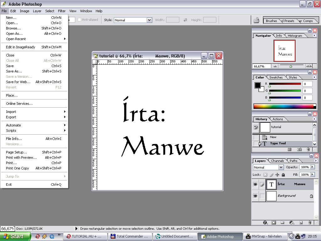 Kezdjük az elején. Mondjuk ott, hogy indítsuk el a Photoshop-ot (nekem 8-asom van, de régebbiekre is érvényesek, nagyjából a dolgok). Menjünk sorban.